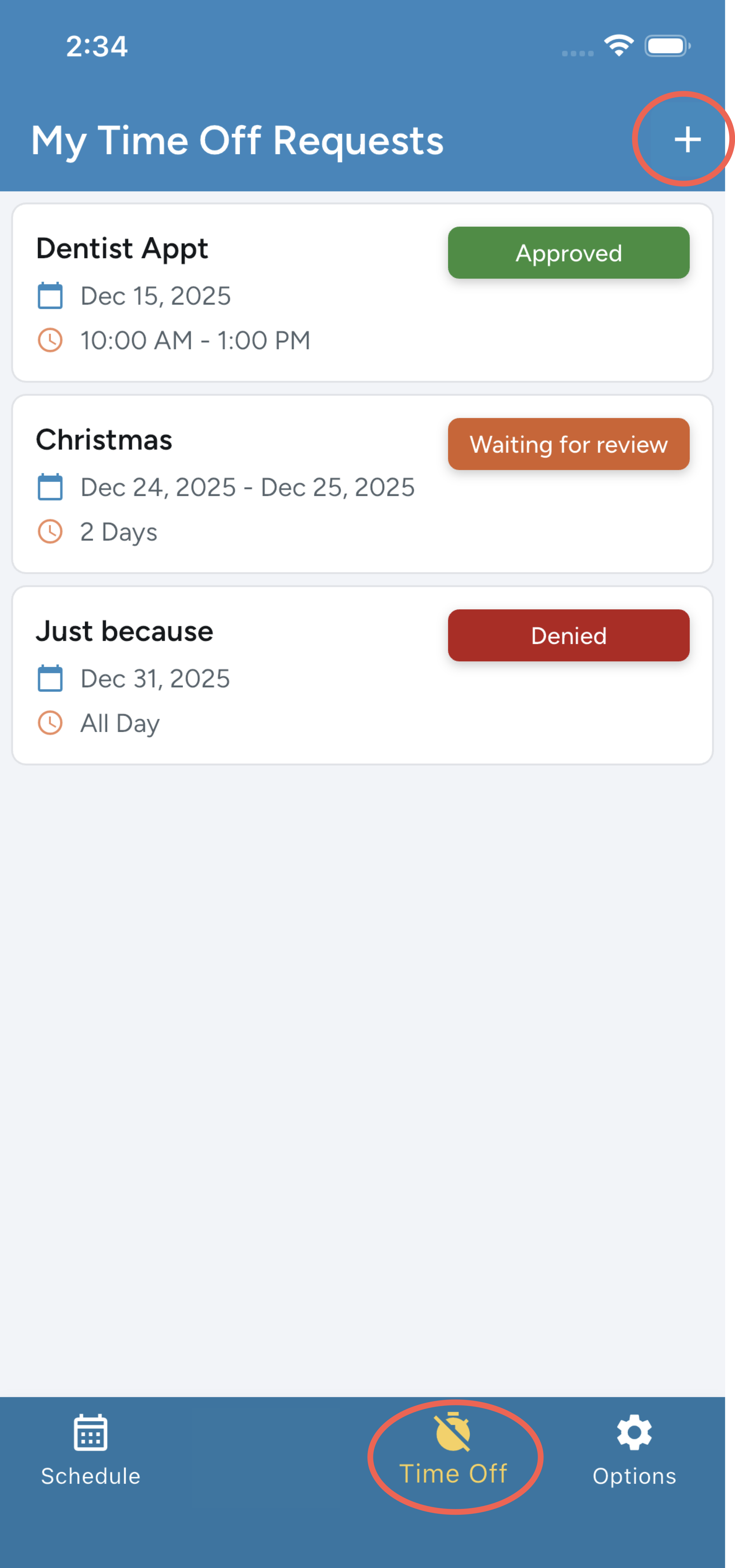 This screen shows all of your time-off requests, with the soonest upcoming request listed at the top.