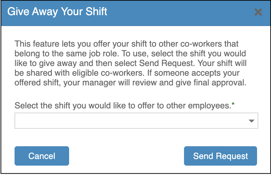 Shift Give Away allows you to offer one of your upcoming shifts to other employees who work the same job role. If another employee chooses to pick up your shift, the request is sent to your manager for final approval before the schedule is updated.