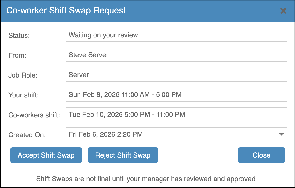 Accept Shift Swap – agrees to the swap and sends it to the manager for final approval