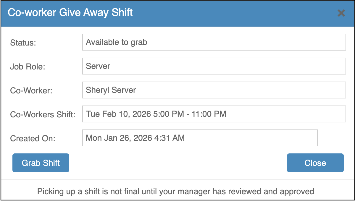 Once a manager approves a give-away request, the shift is removed from the available list and added to the approved employee’s schedule.