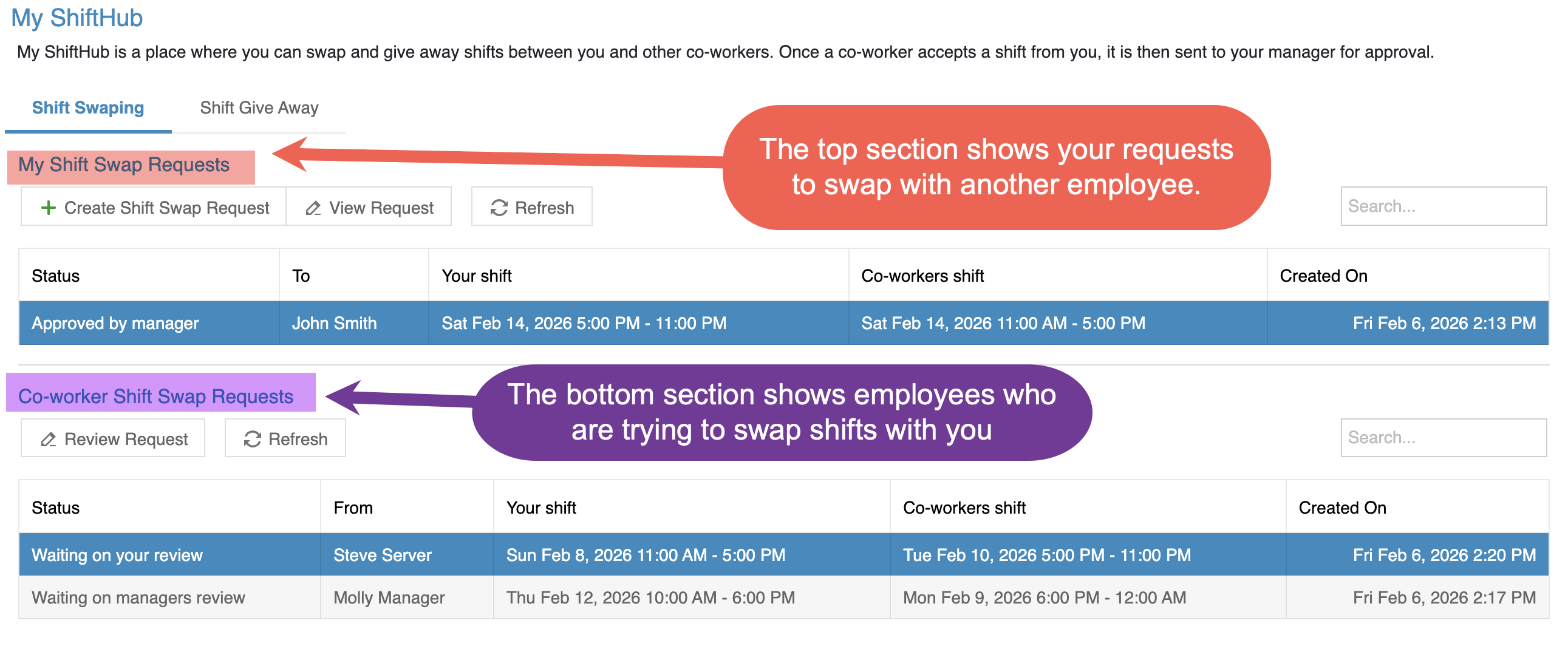 My ShiftHub allows employees to request shift swaps or give away shifts with other co-workers. Once a co-worker accepts a request, it is sent to a manager for final approval.