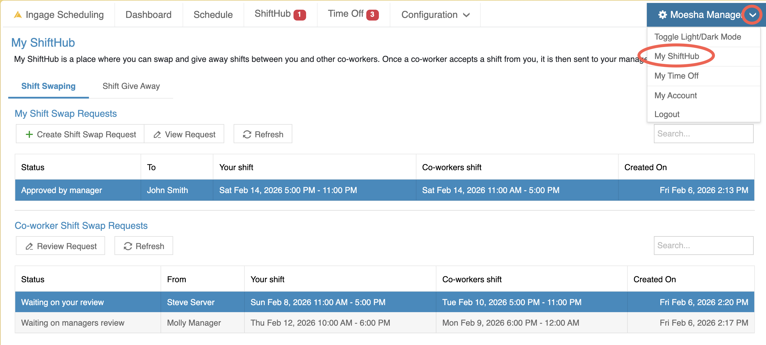 When a co-worker requests to swap shifts with you, the request will appear in the Co-worker Shift Swap Requests section of ShiftHub.