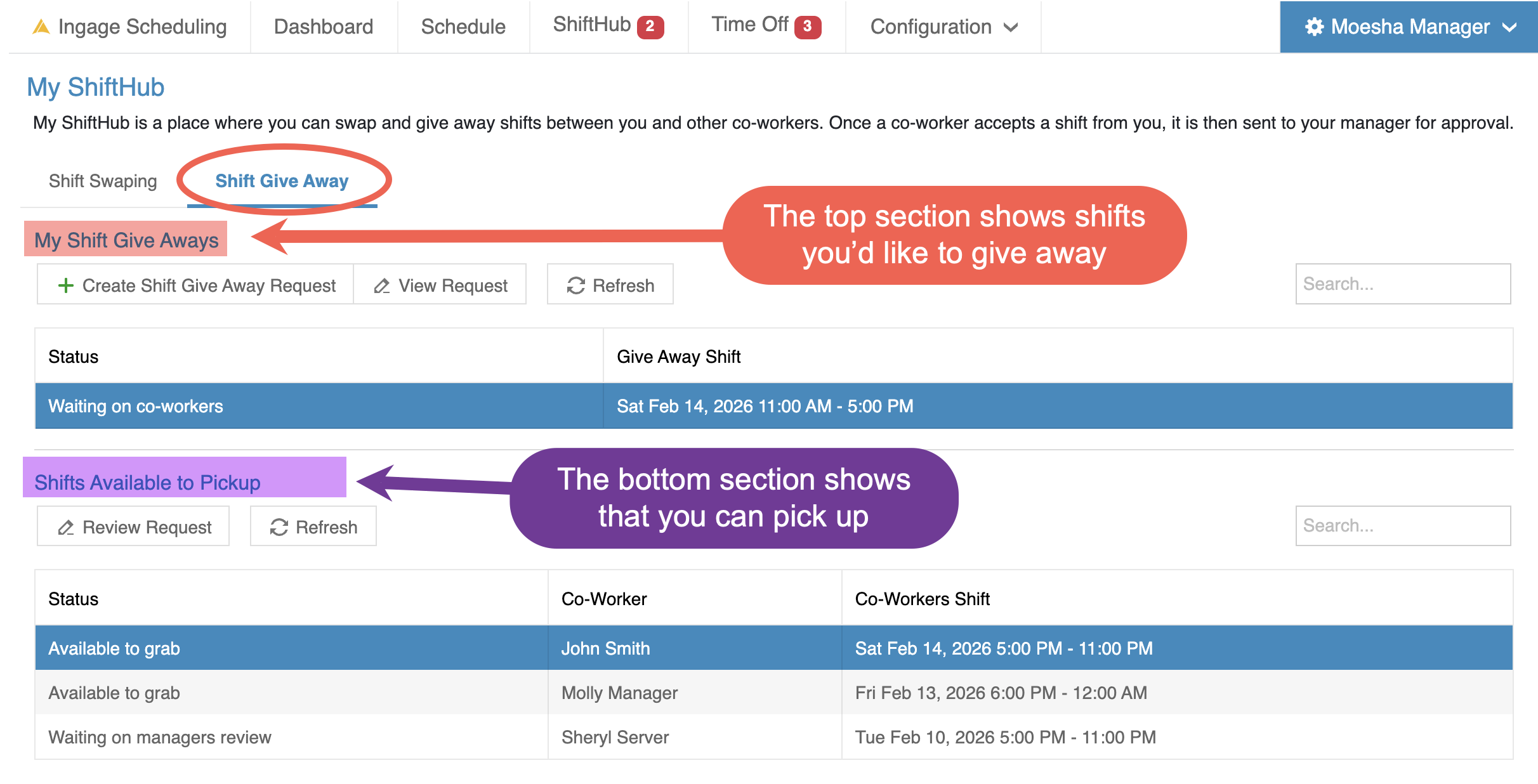 When you click My ShiftHub → Shift Give Away, you will see two sections:
