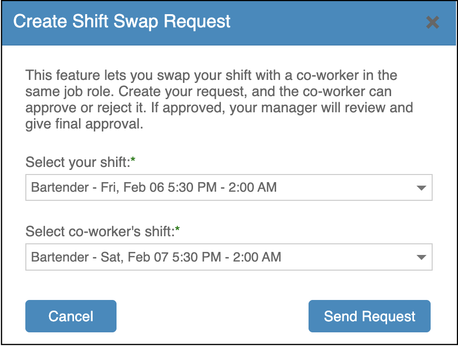 For example, if you select a Bartender shift, the second dropdown will only show other Bartender shifts that are available to swap with.
