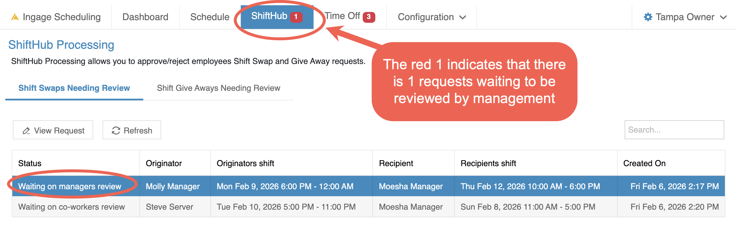 When there are requests that require manager action, you will see a notification badge on the ShiftHub tab so you know something needs to be reviewed.