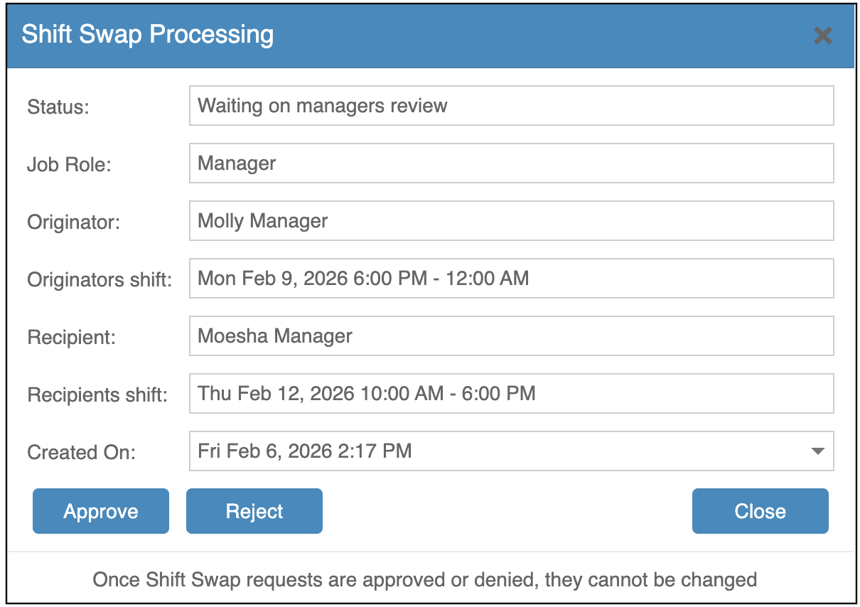 Managers review and approve these requests to ensure proper coverage and role alignment before the schedule is updated.