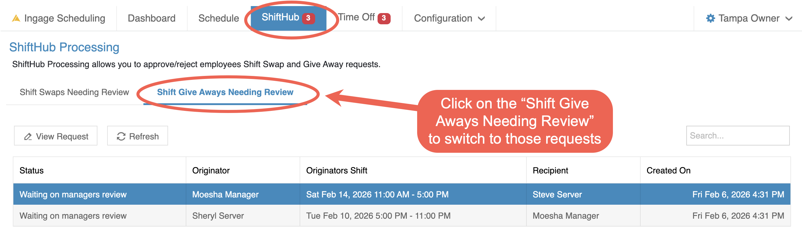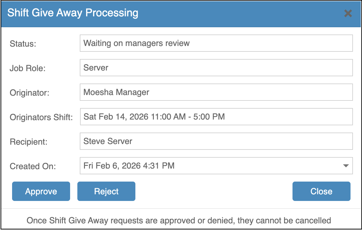 Managers will only see Shift Give Away requests that are waiting for manager approval.
