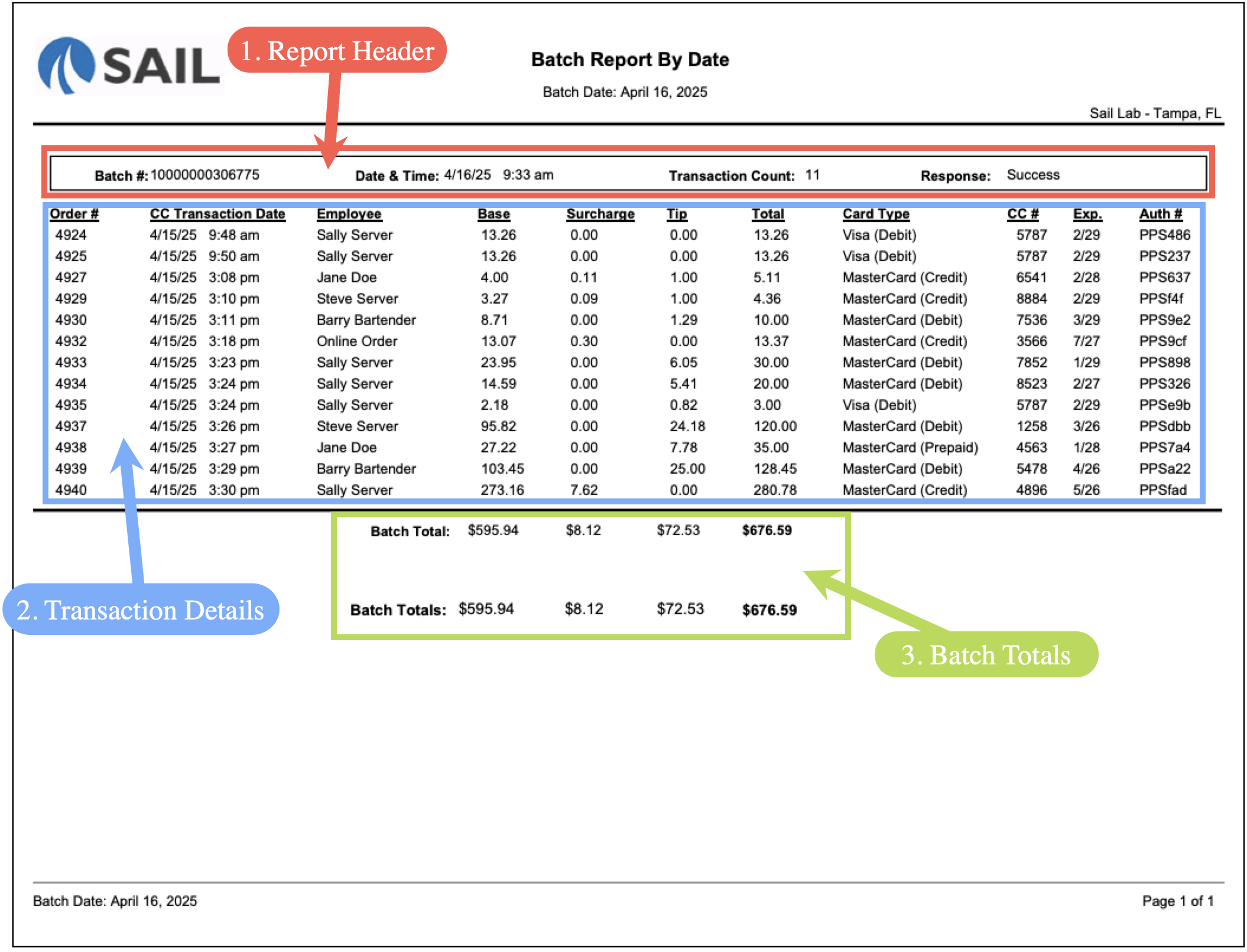 The Batch Report by Date provides a detailed summary of all card transactions that were grouped (or “batched”) together on a specific date. This report helps you verify sales, tips, card types, and totals, and ensures your batch was successfully settled with the processor.