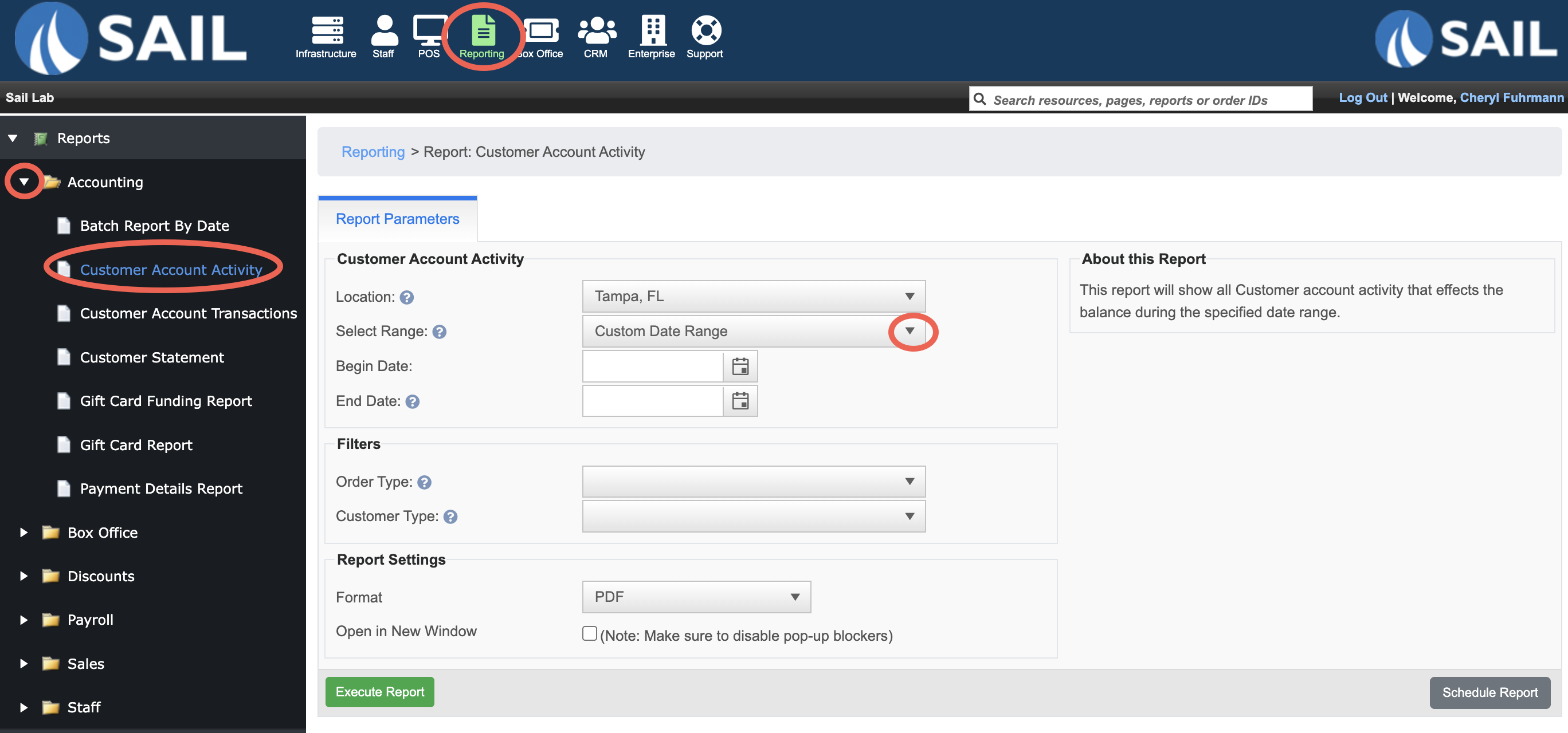 - Backoffice --> Reporting --> Reports --> Accounting folder --> Customer Account Activity Report --> Select a Date Range --> Execute