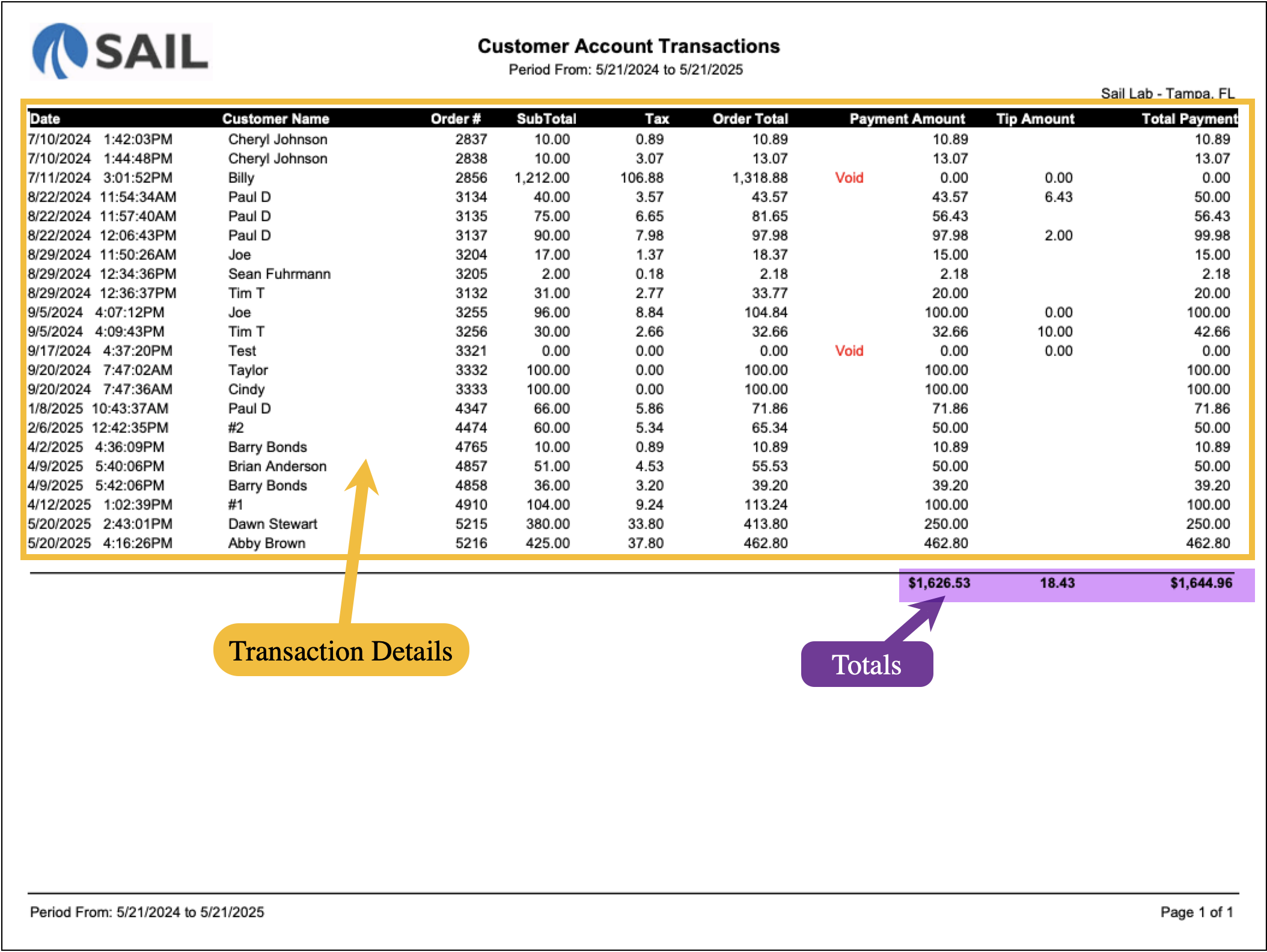 The Customer Account Transactions report shows all times a customer account was used as the tender to pay for items or redeem deposits. This allows you to track account-based payments, verify balances, and monitor when and how accounts were used across a selected date range.