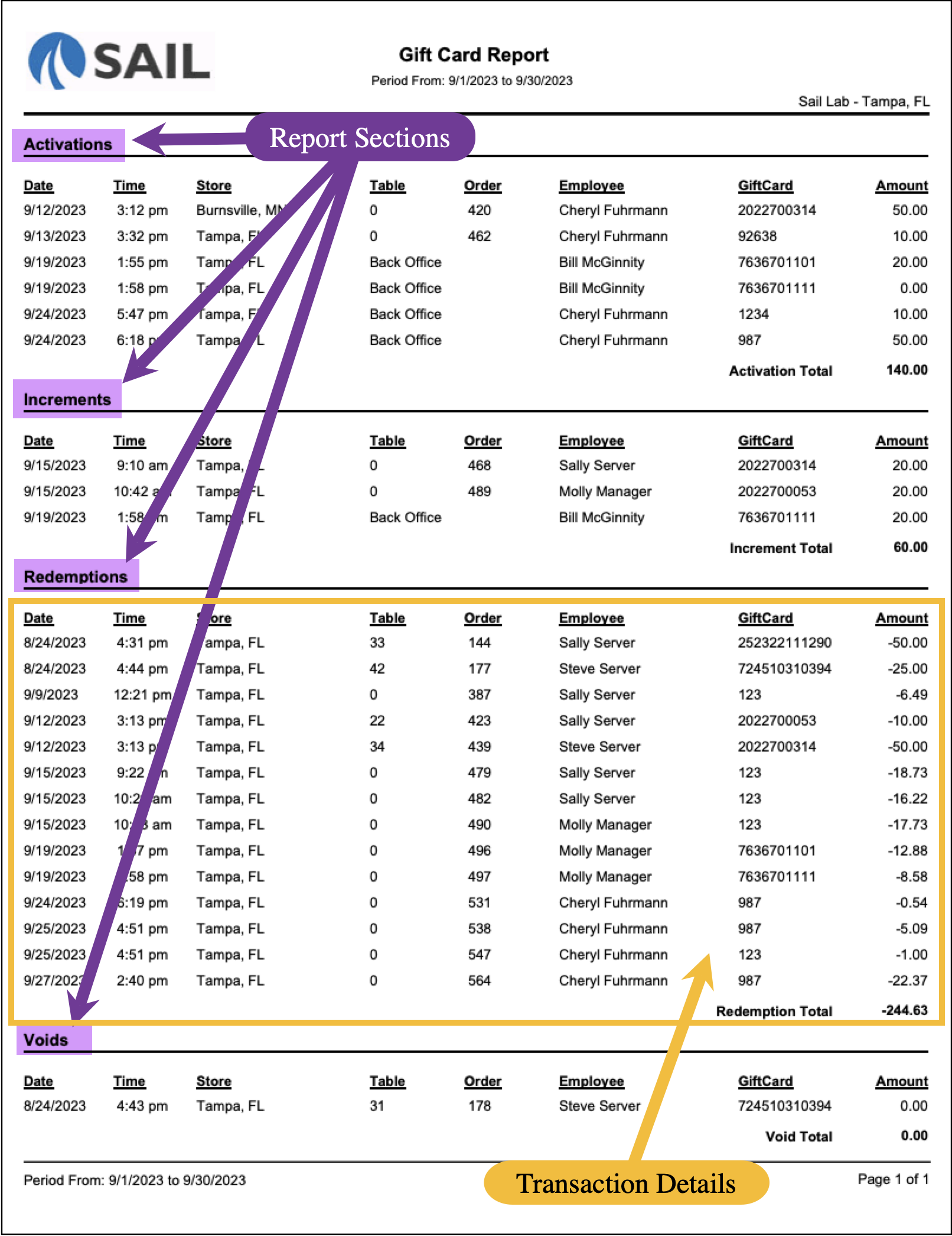 The report is broken down into four sections, each showing a different type of gift card activity: