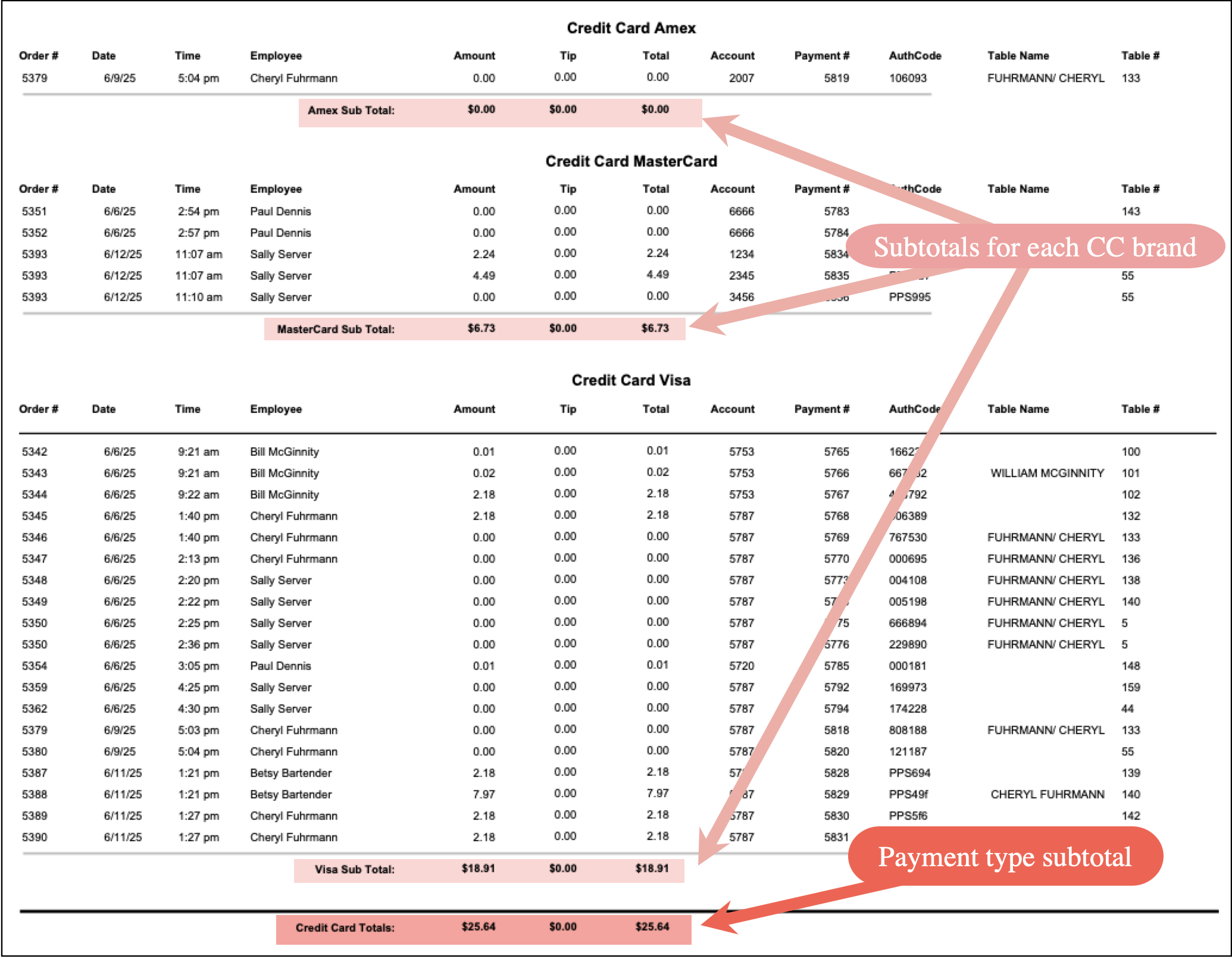 Each card brand (Amex, MasterCard, Visa, etc.) has its own sub total.