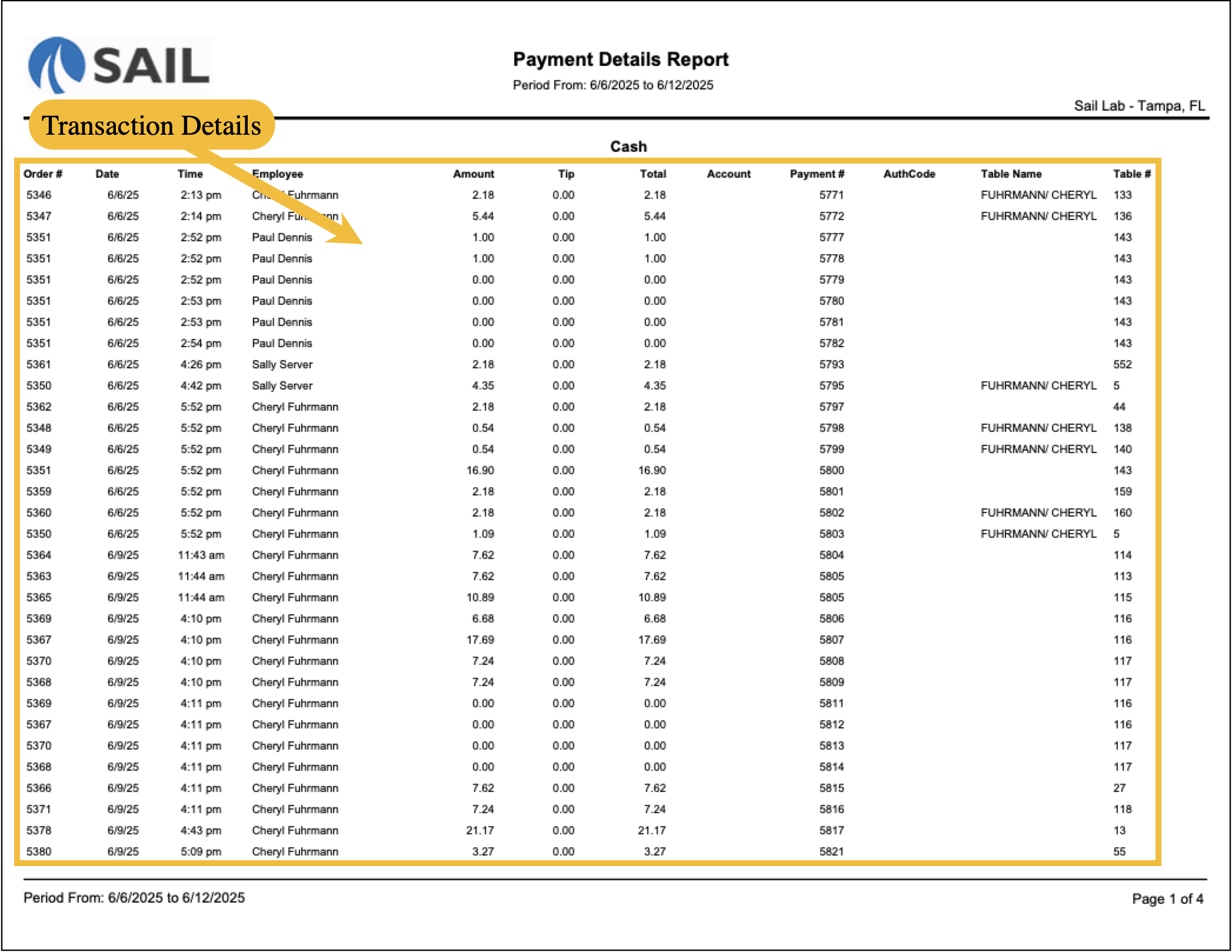 The Payment Details Report provides a detailed record of all payments received during a selected date range. It breaks down payments by type (cash, check, credit card, gift card, delivery services, etc.) and shows individual transactions processed by employees. This report is essential for reconciling sales, balancing payment methods, and reviewing detailed payment activity.