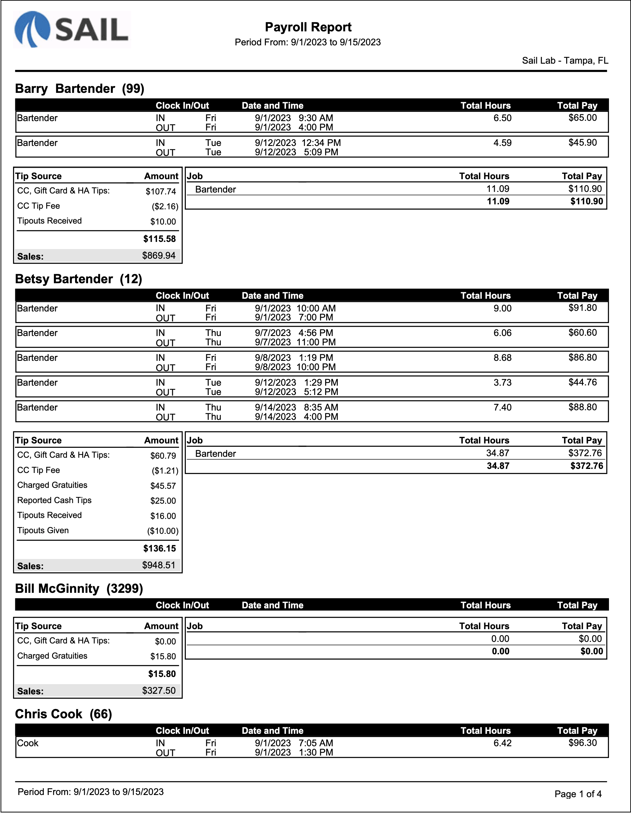 Below each employee’s hours and pay, the report lists their tips and sales.