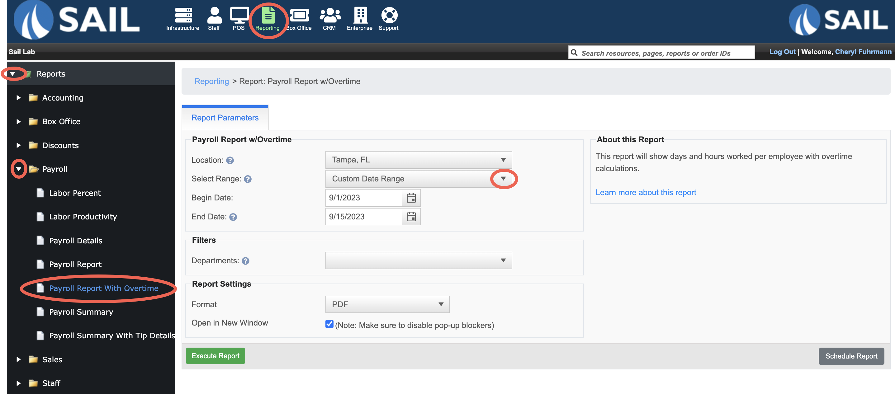 - Backoffice --> Reporting --> Reports --> Payroll folder --> Payroll Report with Overtime --> Select Date --> Execute