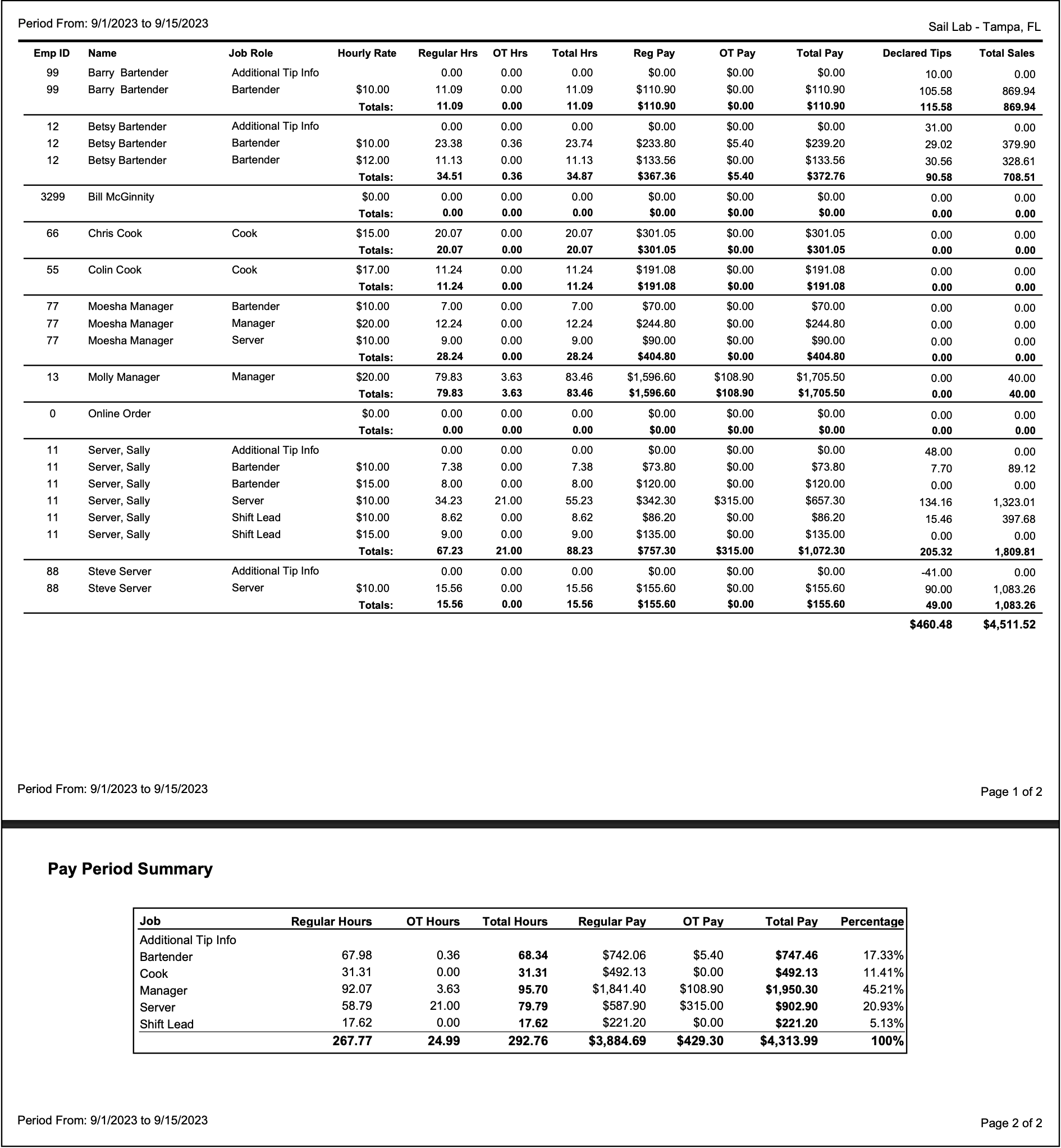 The Payroll Summary Report provides a consolidated overview of employee payroll for a specific pay period. It summarizes regular and overtime hours, pay, tips, and sales for each employee, along with a breakdown by job role. This report is especially useful for high-level payroll review and payroll submission.