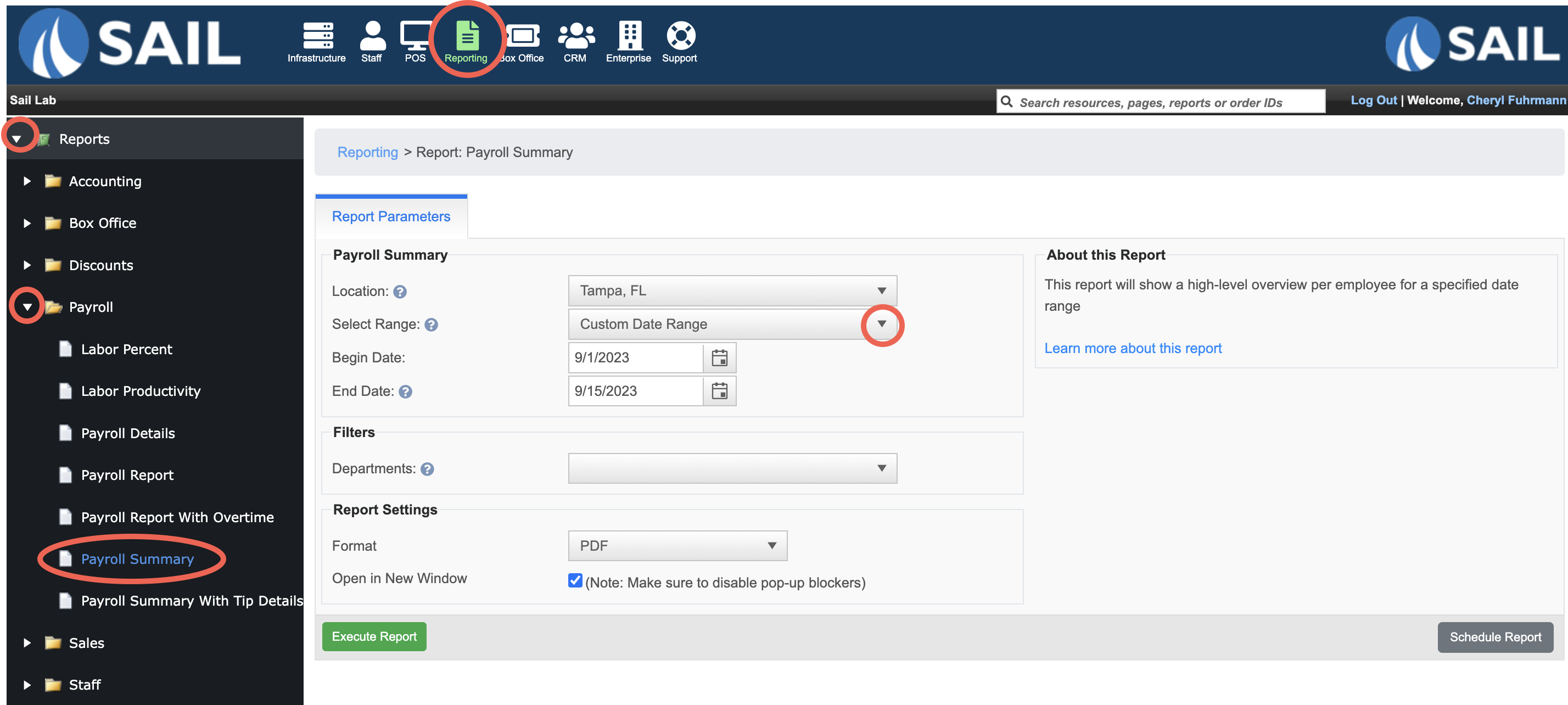 - Backoffice --> Reporting --> Reports --> Payroll folder --> Payroll Summary --> Select Date --> Execute