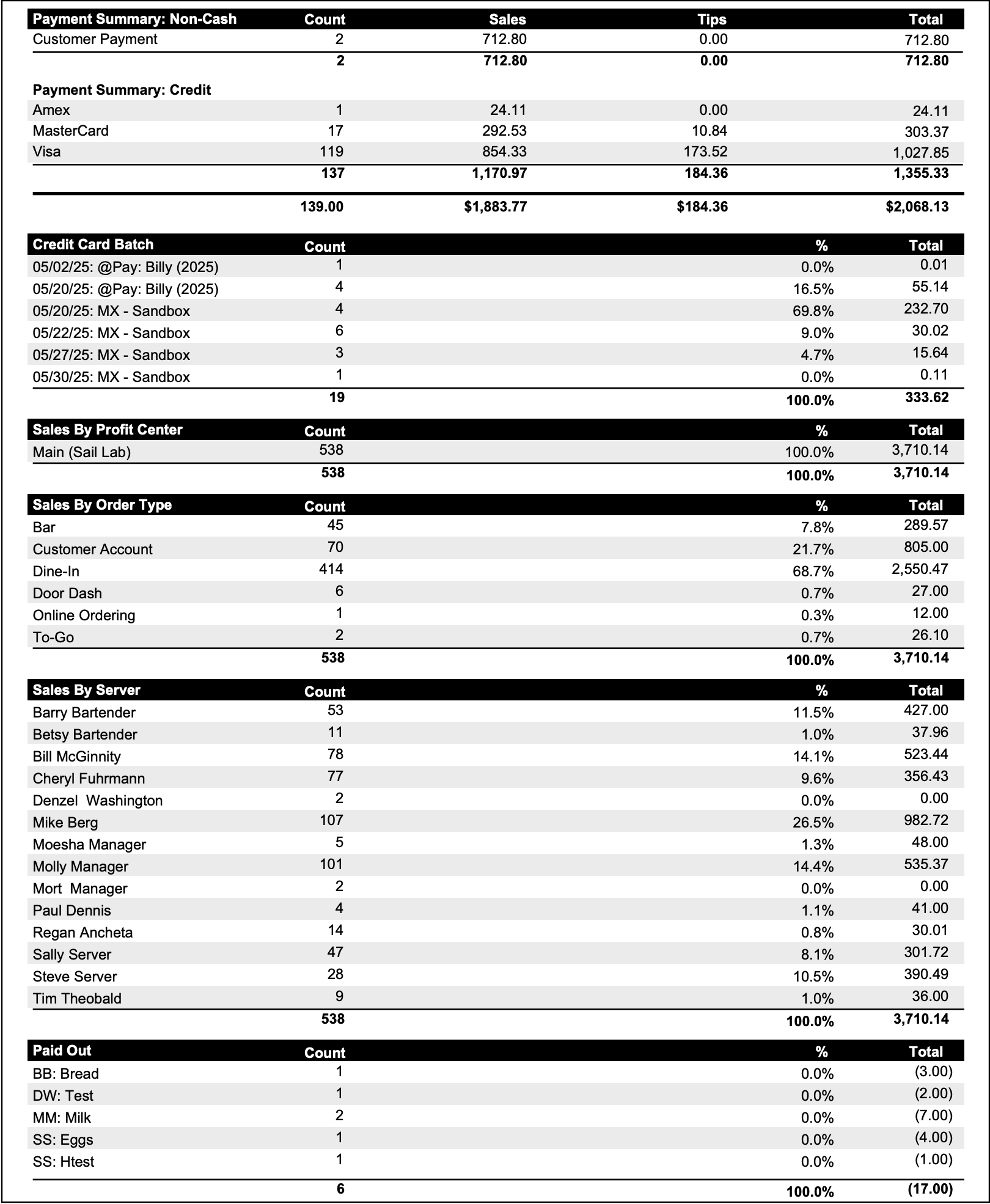 - Paid Outs – Lists all payout details with initials and notes from the reporting period.