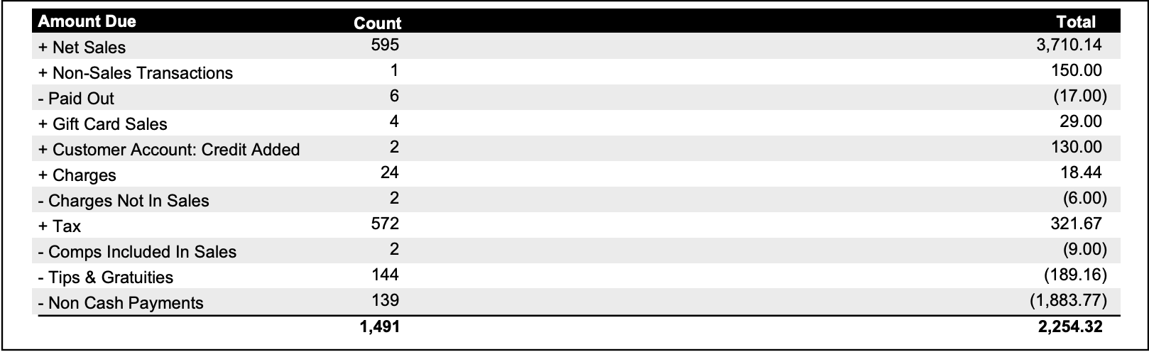The Amount Due at the bottom represents your total net cash for the period — this number should match your combined bank deposits for the same range.