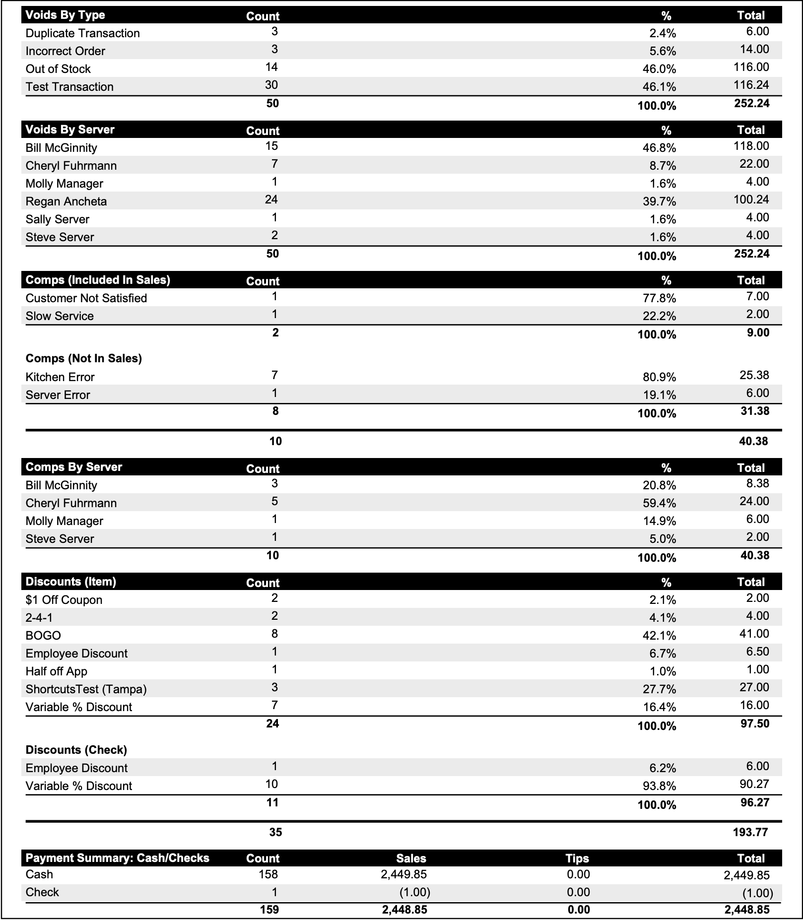 - Voids, Comps, and Discounts – Lists totals by type and by employee, to help identify trends or training needs.
