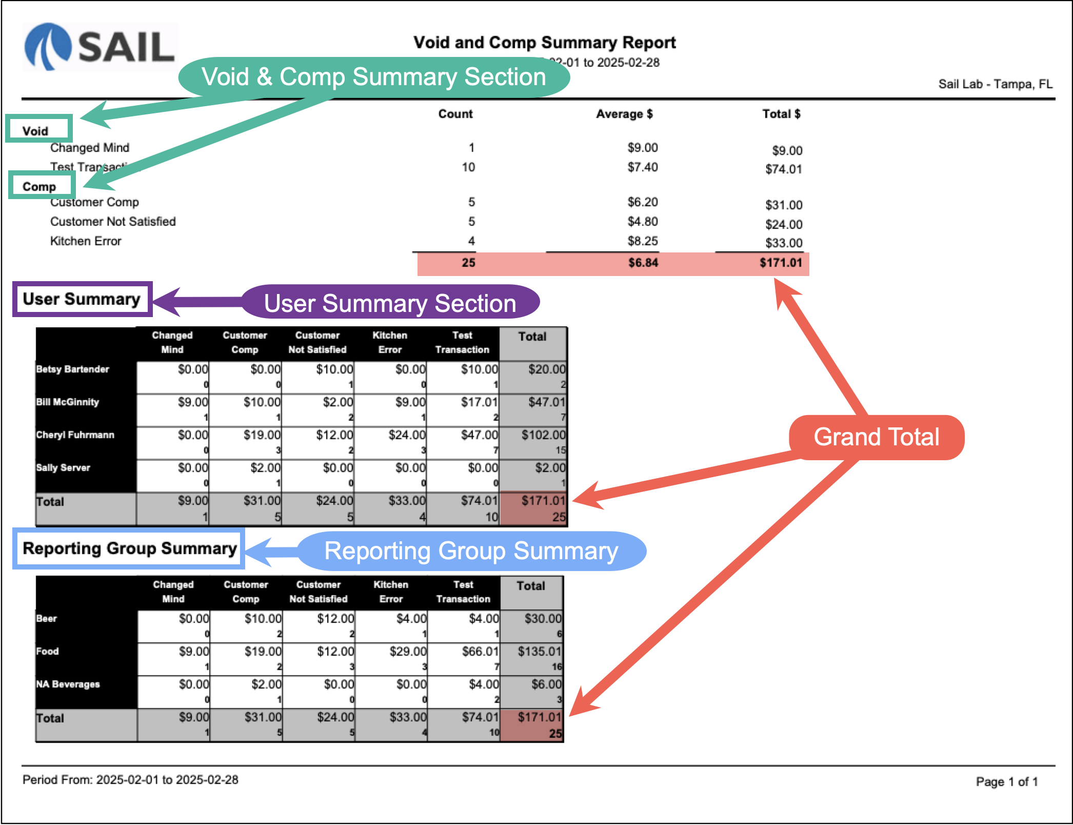Overall Average $ – The average value across all voids and comps. (calculated as Grand Total $ ÷ Total Count).