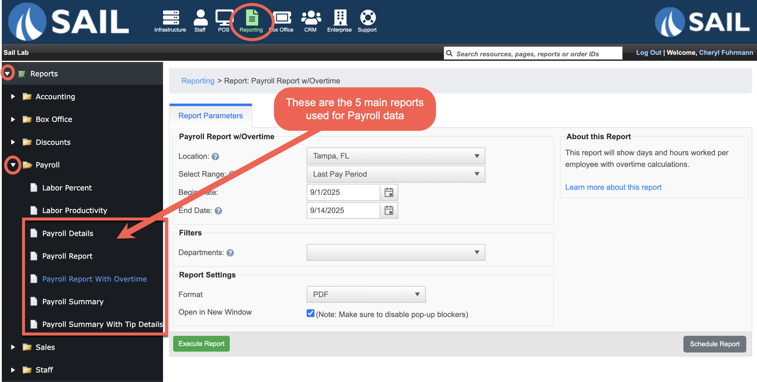→ Run Payroll Report (or Payroll Report w/ Overtime if OT is important). -