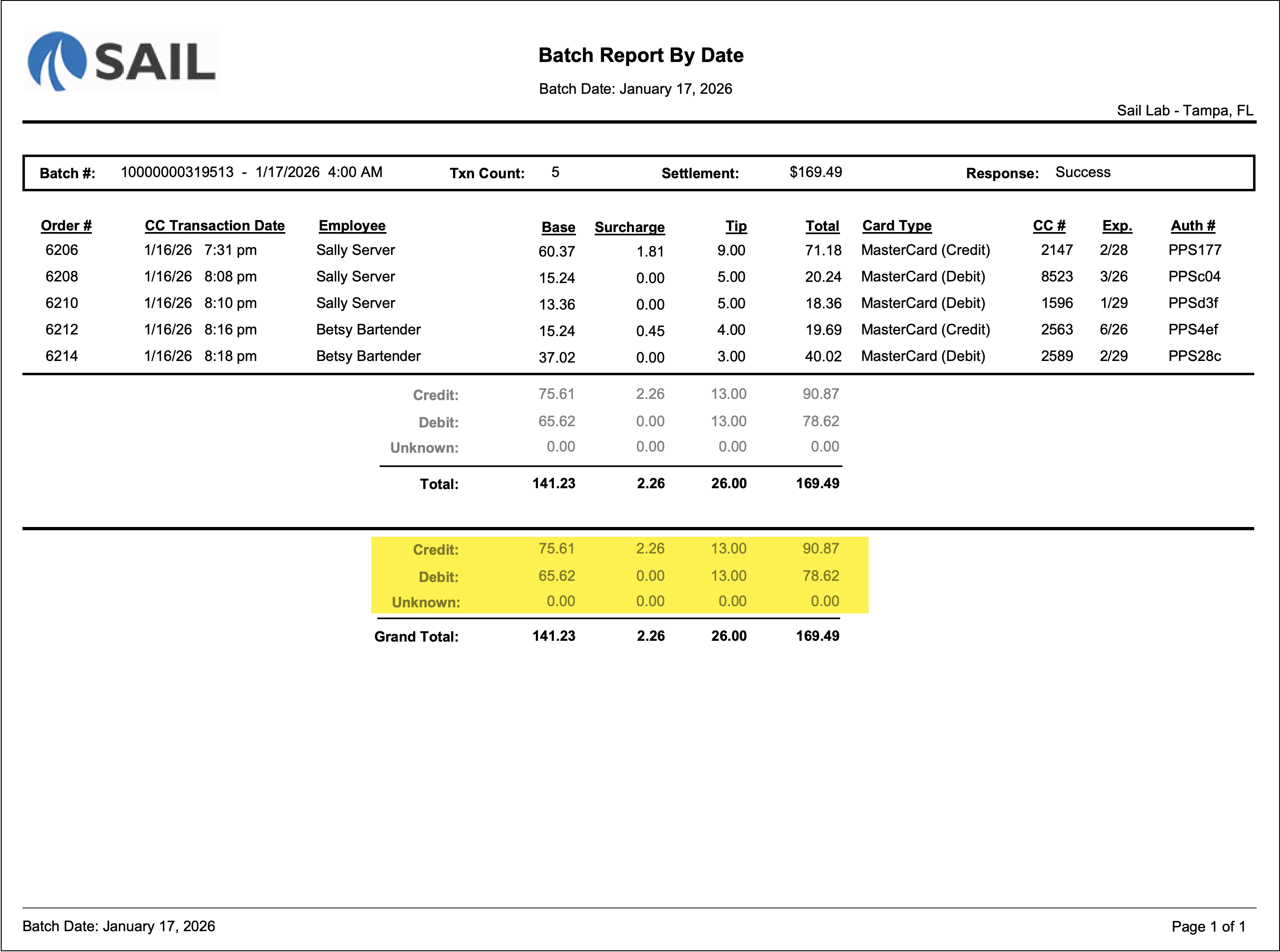 The Payment Details Report and Batch by Day Report now separate credit and debit card totals. This makes it easier to review card activity and accurately calculate surcharge amounts for restaurants using credit card surcharging.