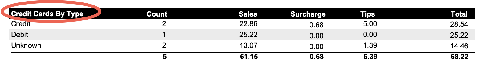 A new optional section called Credit Cards by Type can now be added to the Daily Close Report. This section breaks card totals out by credit and debit, making it easier for restaurants using surcharging to see how much surcharge was collected on credit card transactions.