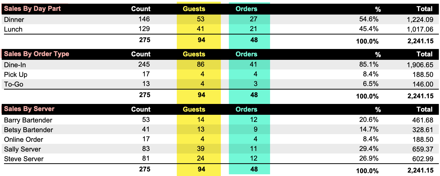 - This provides additional visibility into guest traffic and order volume alongside sales totals, helping managers better understand daily performance at a glance.