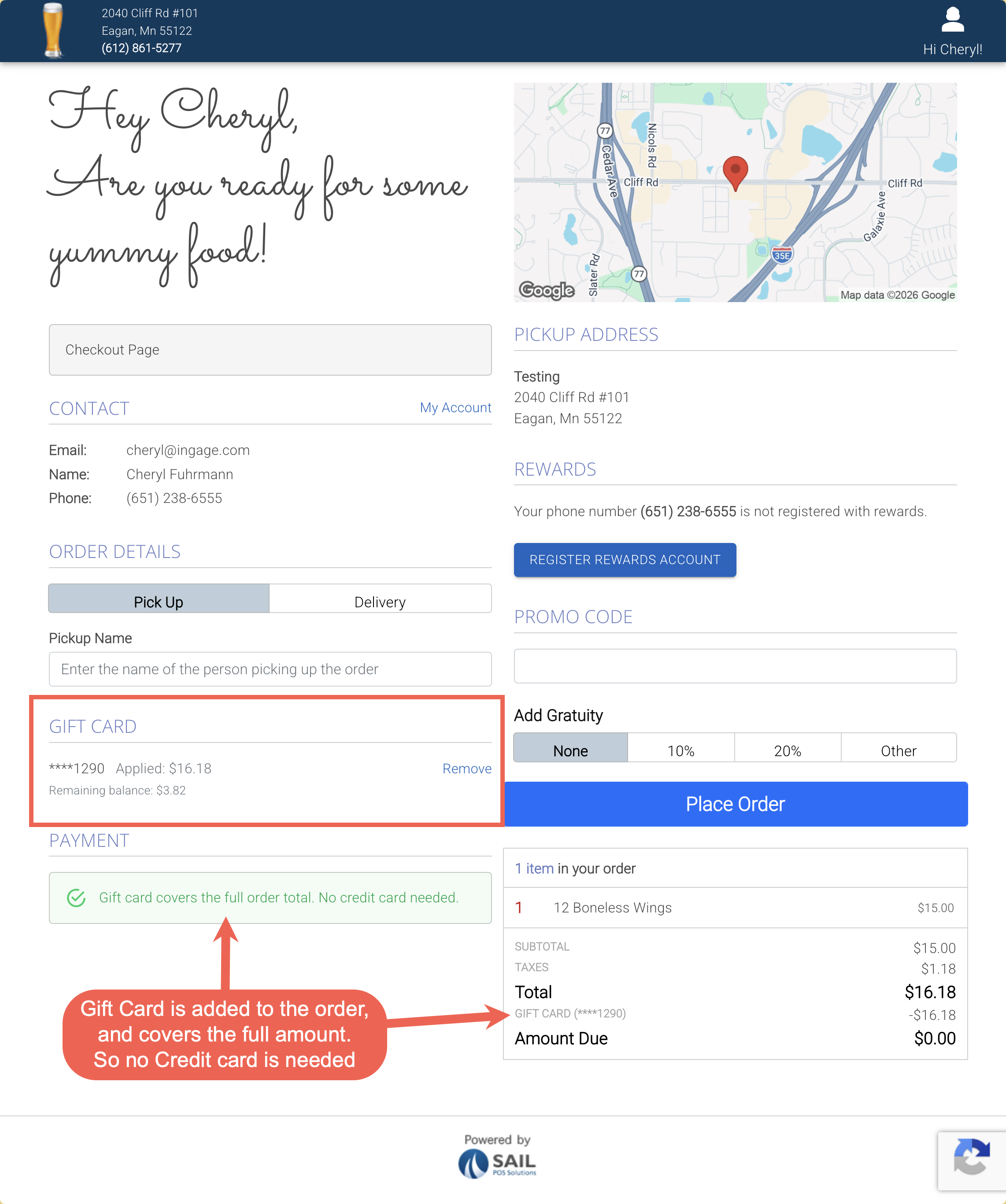 - If the gift card balance covers the full order total, no additional payment method is required at checkout.