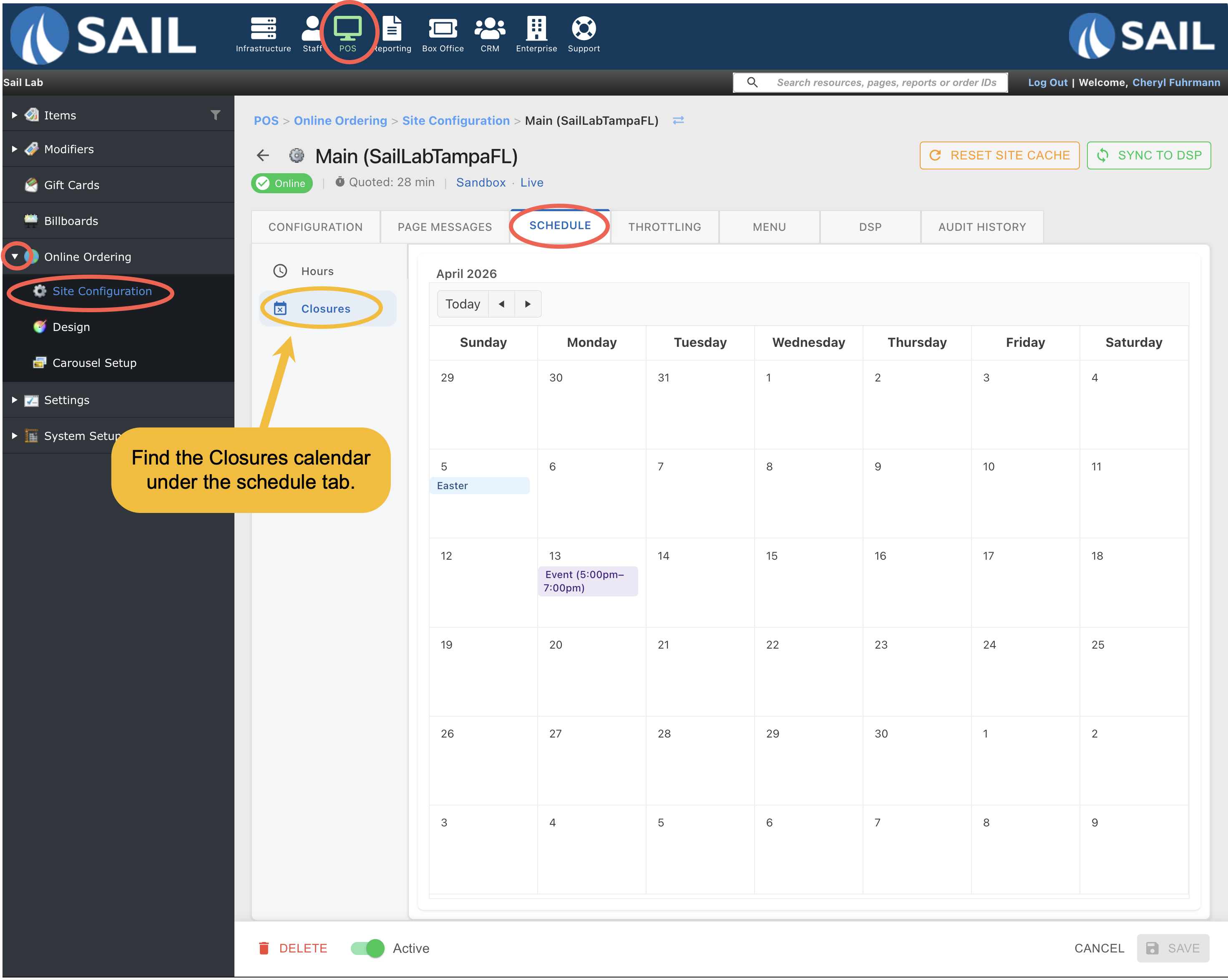 - To find the calendar go to Backoffice --> POS --> Online Ordering --> Site configuration --> Click on the Site --> Scheduling tab --> Closures sub-tab