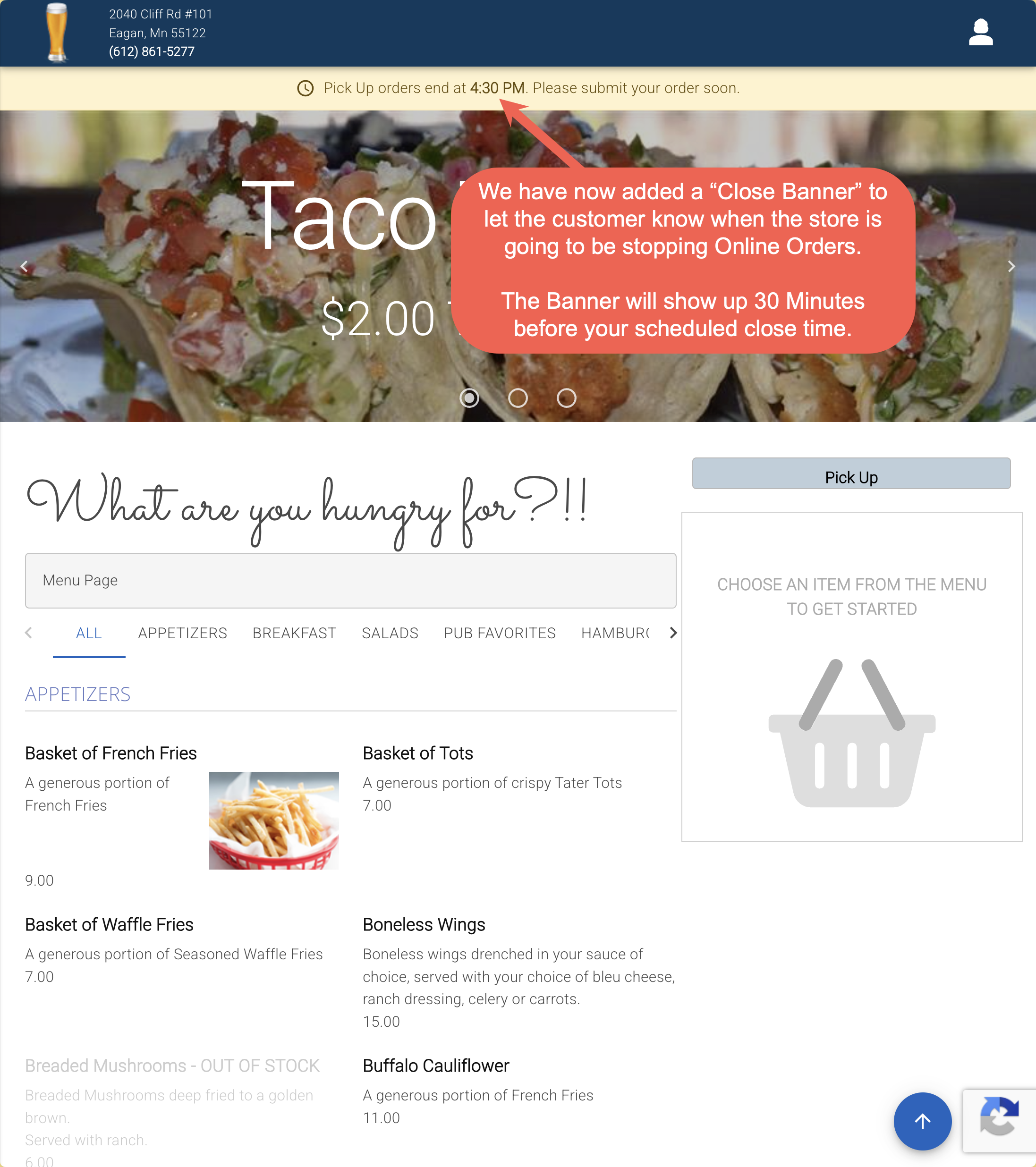 Online ordering now includes a closing banner to notify customers when the store is approaching its online ordering cutoff time. The banner appears 30 minutes before online ordering closes, helping encourage customers to place their orders in time. This helps set clear expectations for when orders will no longer be accepted.