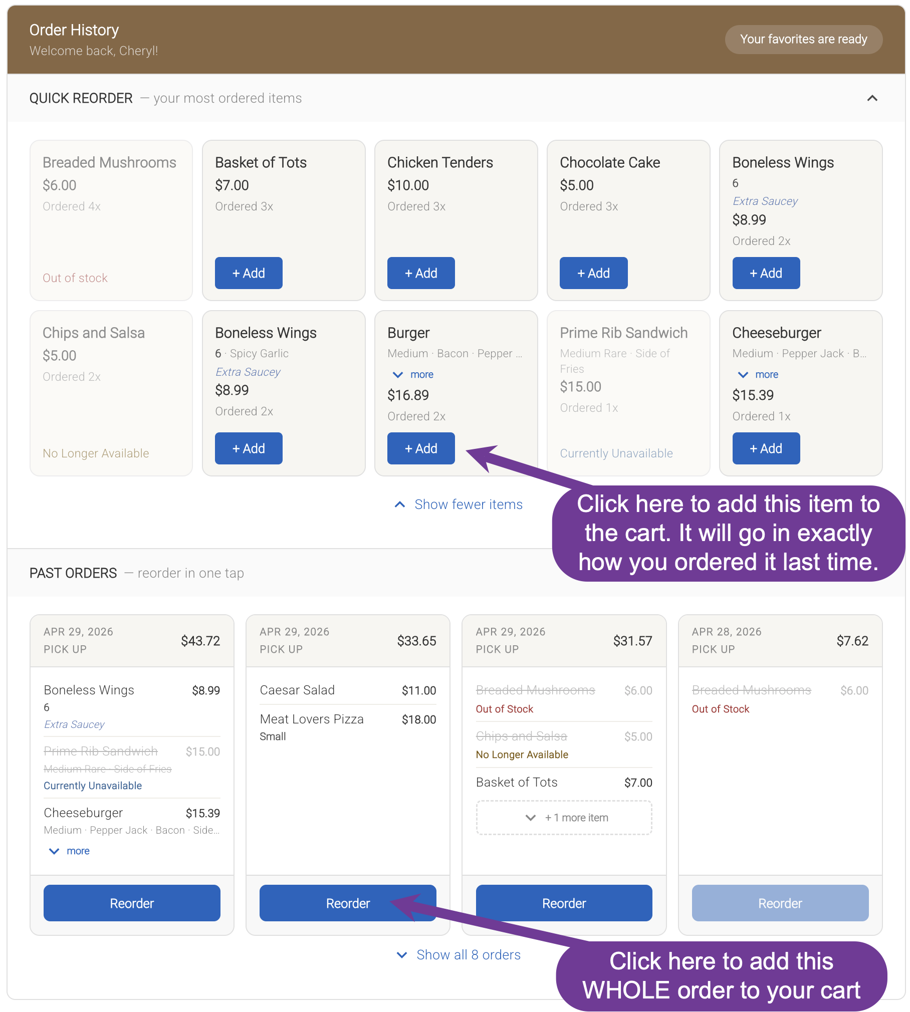 Online ordering now includes Order History and Quick Reorder, making it easier for customers to place repeat orders. Customers can quickly add their most frequently ordered items or reorder past orders with a single click, using the same selections as before.