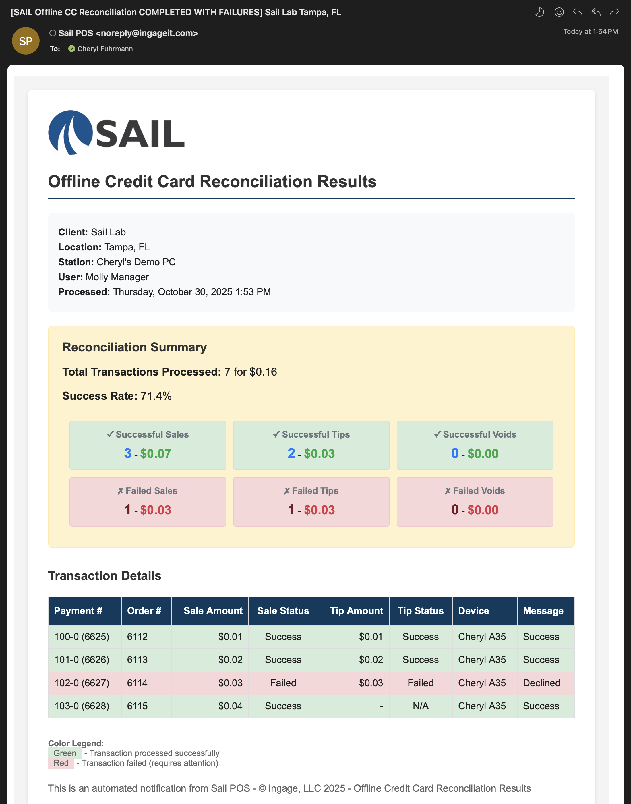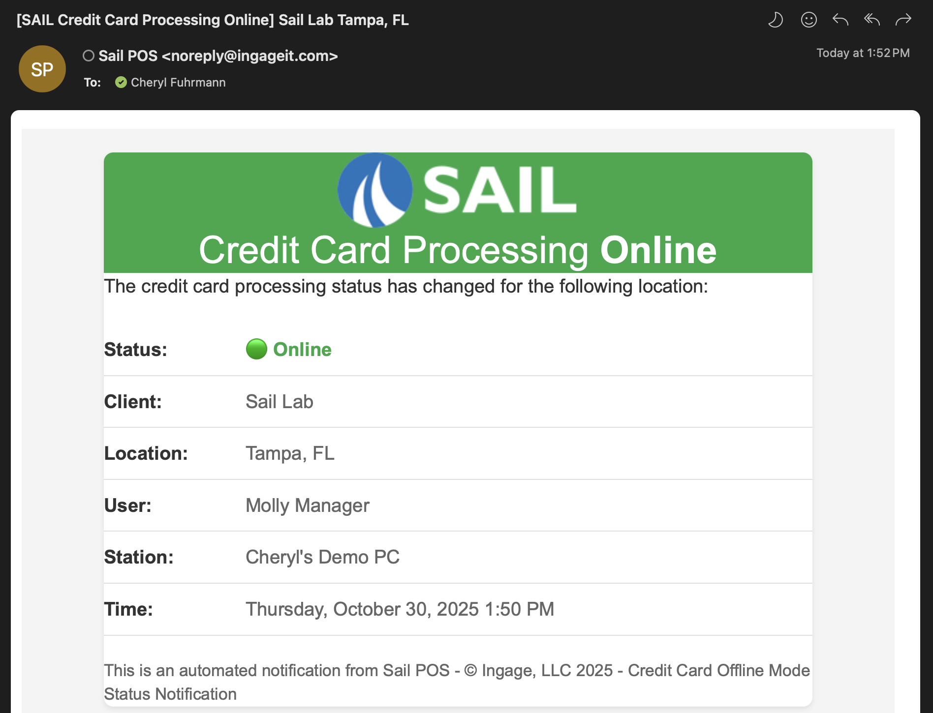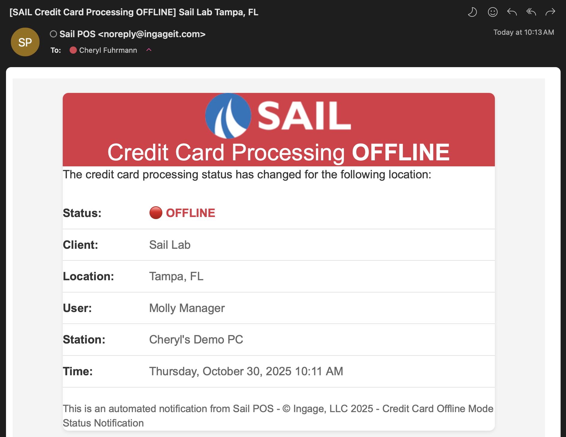 - Once you have Processed all Offline Transactions an email will be sent out to Ingage It support staff, any email address on the daily close setting, and the employee who enabled the Offline mode. same question as above. It will detail every single transaction that was ran during Offline Mode. Success and Declined ones.