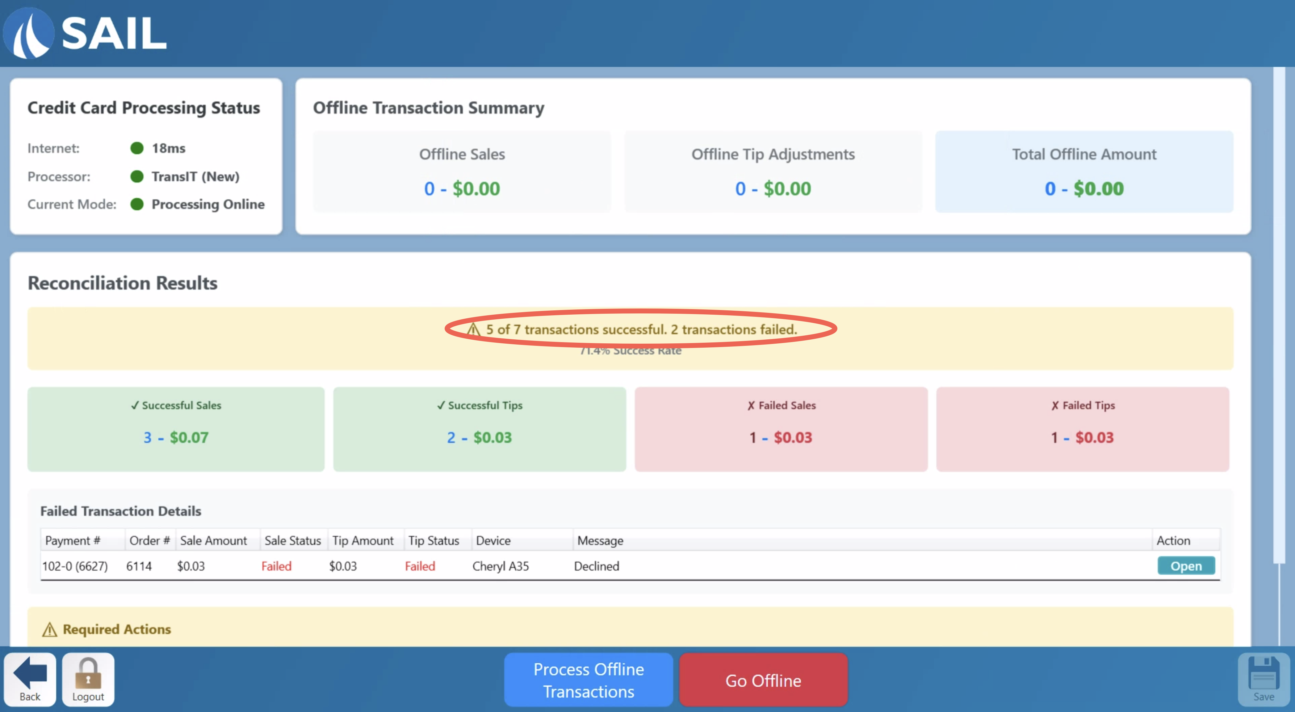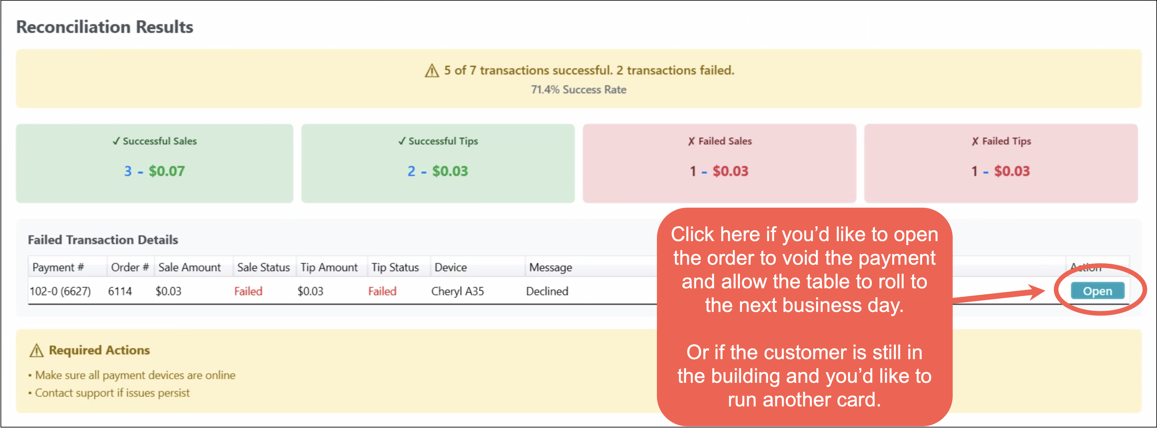 - Once everything has processed you will get your reconciliation results. It will tell you how many were successful and how many failed. Below that it will list out all failed transactions. You have 2 options with Failed transaction