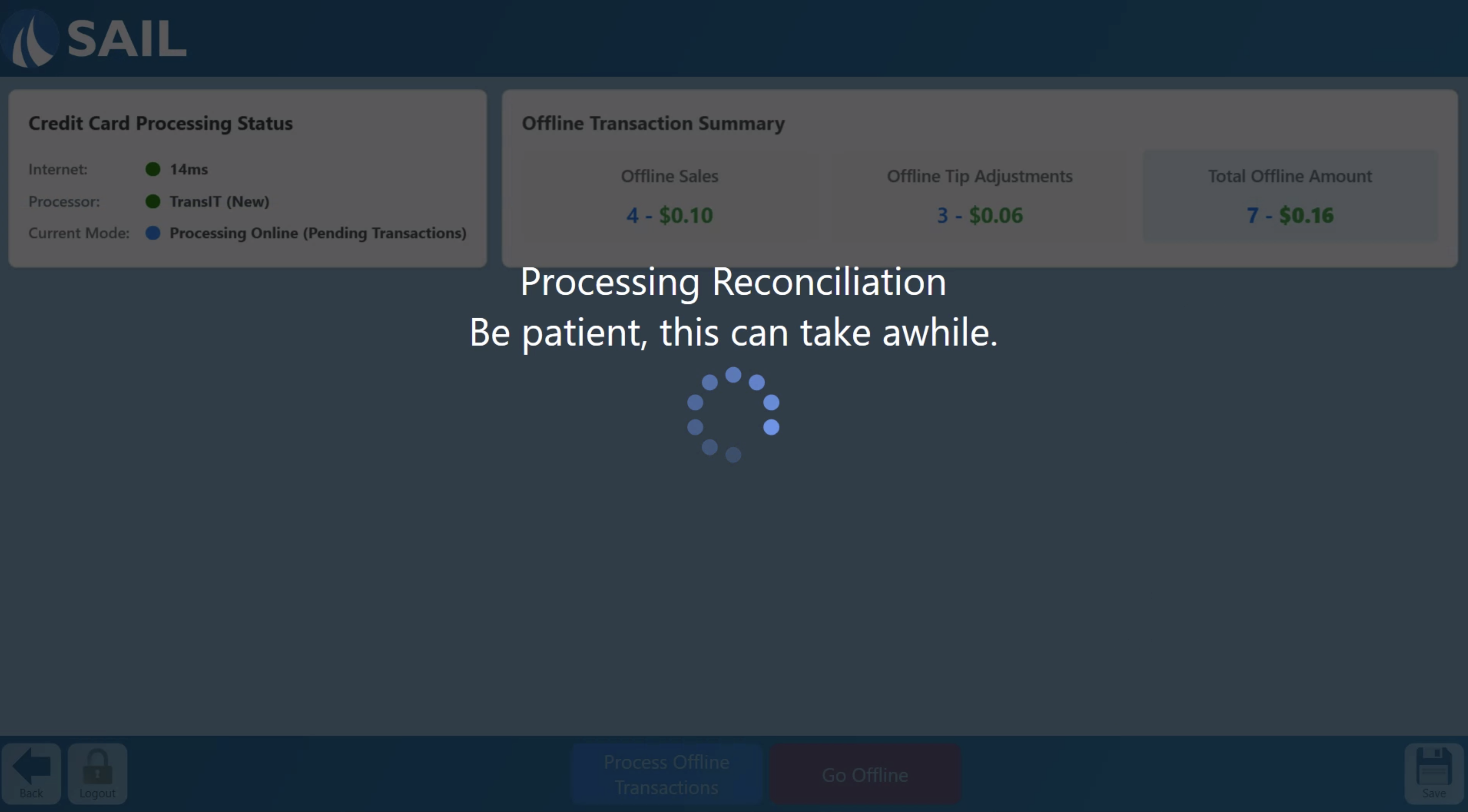 - The Screen will give you a "Processing Reconciliation" screen until the process is done. You can use other terminals to ring in items and cash people out, but you can not take any credit cards until this process is done. (it takes about 3-5 seconds per card, So if you had 100 cards, it will take about 5-8 minutes to process everything)