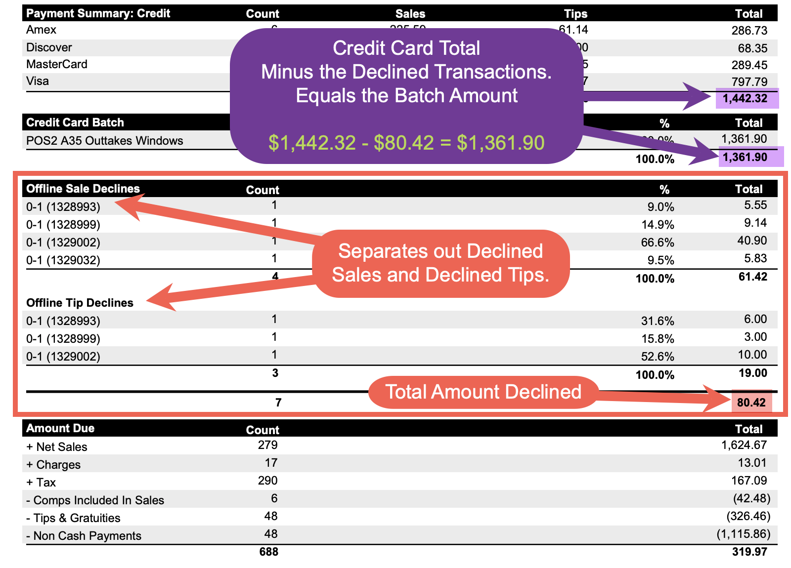 - Any declined Sales or Tips will show up in its own section right above the Amount due section