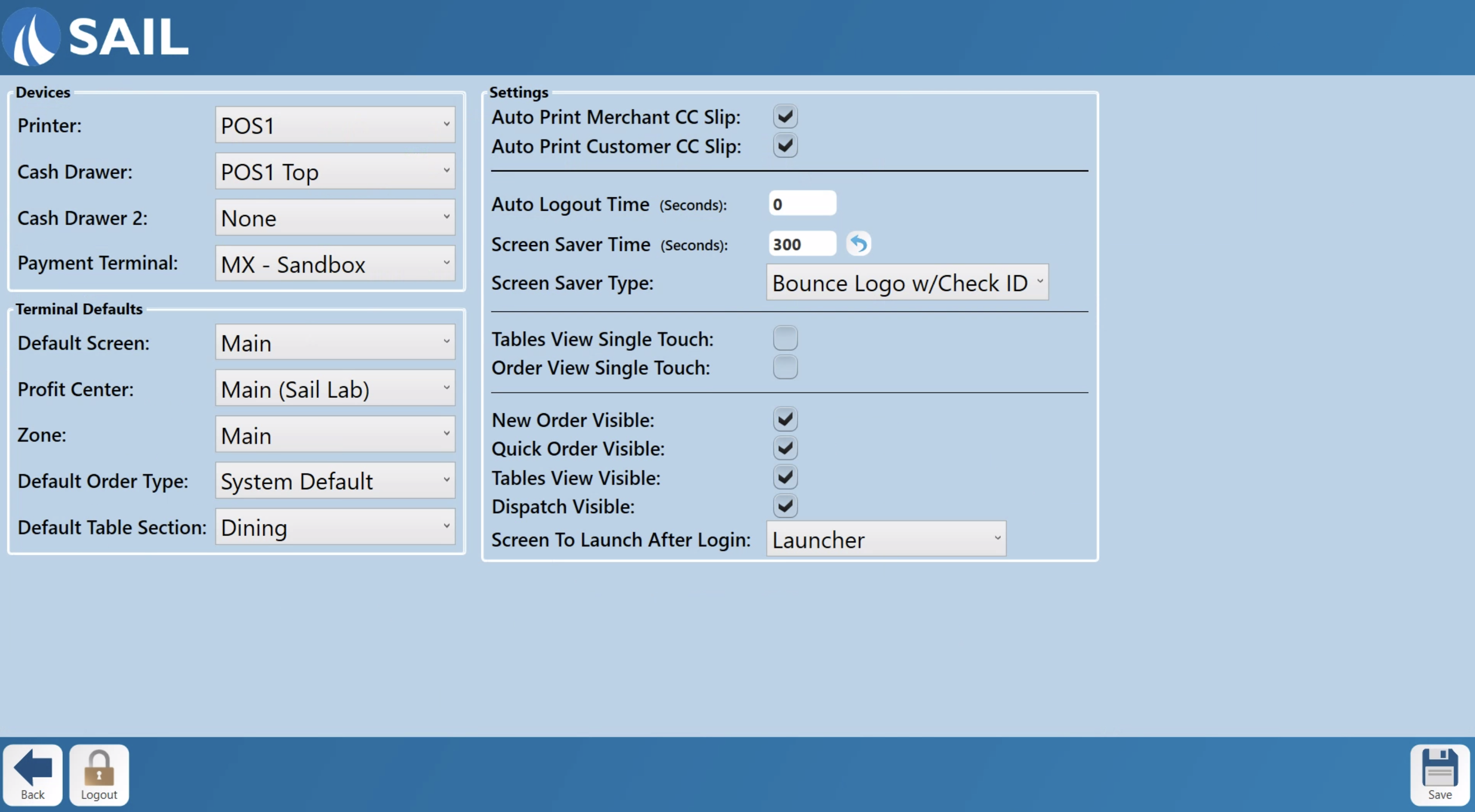 5. Default Screen: This setting connects the terminal to your Backoffice configuration. Most locations will only see one option here, making setup quick and straightforward.